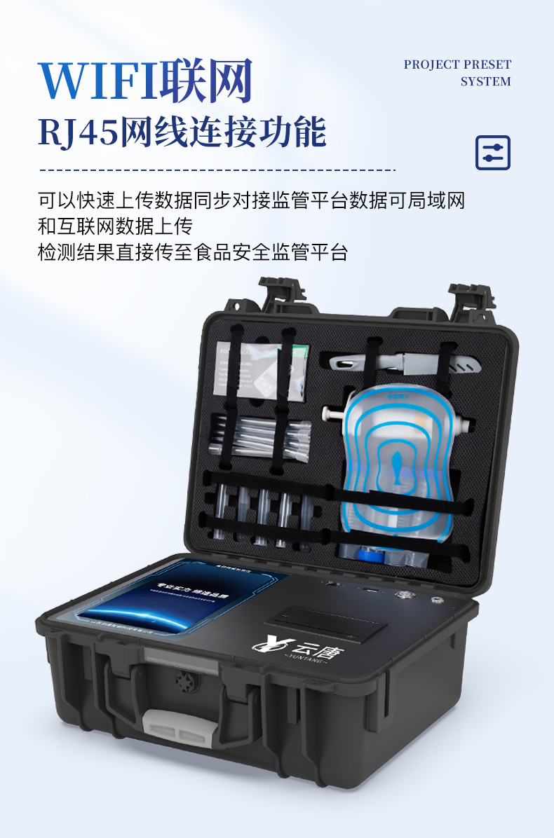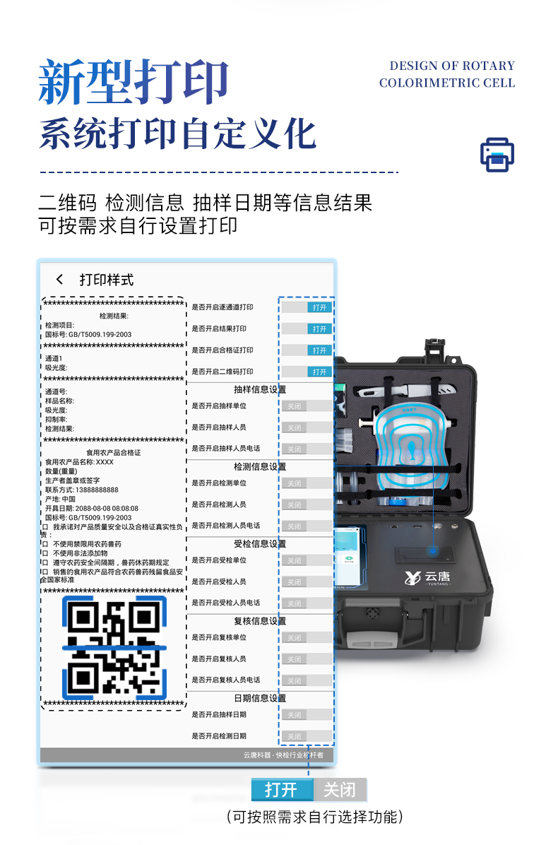 7、图像调整功能:可根据金标卡读取图像进行多方位调整,使其更精准读取结果。 | 8、仪器检测系统拥有庞大数据库,并且构建了完善的检索、修订功能。食品库涵盖多种样品名称,可按需添加或删除、编辑样品名称;产品数据库以及历史检测记录支持一键检索功能。 | 9、系统打印自定义化,打印格式多样化,产品合格证(国家标准要求),二维码,抽样信息、检测信息,受检信息、复核信息、抽样日期、检测日期等信息结果,可按需求自行设置打印内容。 | 10、A4纸版本报告打印功能:设备拥有两种结果展示方式,可以自动生成A4打印模板和小票打印模板两种样式,可通过WiFi及网线等方式链接外置打印机可进行打印 | 11、仪器具有 wifi 联网上传、RJ45网线连接功能,可以快速上传数据。同步对接监管平台,数据可局域网和互联网数据上传,检测结果直接传至食品安全监管平台。进行区域食品安全监管及大数据分析处理与数据统计,检测区域食品安全长短期动态,达到食品安全问题预估、预警。 | 12、设备支持U盘存储,标准USB接口,免驱动安装。检测结果存储容量20万条以上,可生成Excel表格,进行一键拷贝,并具有登录保护功能,可设置用户名及密码,规范不同人员操作权限,防止非工作人员操作,并且可以进行重新校准、锁定、恢复出厂设置功能。仪器固件可升级,后期检测项目可扩充。 | 13、仪器具备远程升级功能,可定向分客户分仪器更新,开机后自动更新,并可持续性免费更新系统版本,无需像传统产品返厂更新,节省时间及人力成本并避免了物流运输返厂升级导致设备损坏的潜在风险。 |