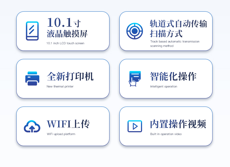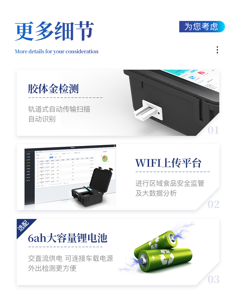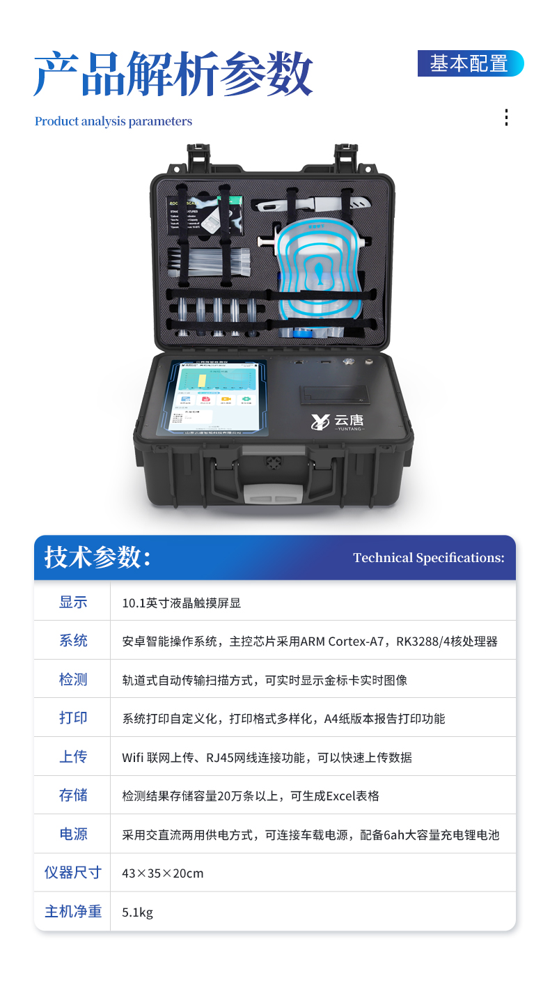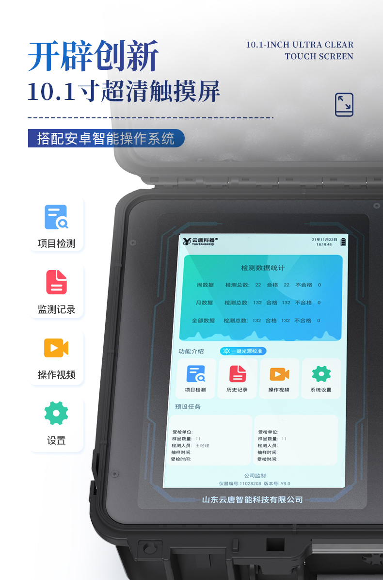 | 1、仪器采用10.1英寸液晶触摸屏显,搭配运行安卓智能操作系统,主控芯片采用ARM Cortex-A7,RK3288/4核处理器,主频1.88Ghz,运转速度更快速,性能更强。 | 2、仪器功能包括:胶体金检测模块、数字化管理模块、无线通讯模块等,可以满足同一软件下实现所有检测项目的检测,并在同一窗口展示检测结果。 | 3、一体化便携式快检设备,采用交直流两用供电方式,可连接车载电源,配备6ah大容量充电锂电池,可以满足现场及流动检测使用的需求。仪器尺寸:43×35×20cm, 主机净重:5.1kg | 4、系统自带数据集成模块,设备首页自动统计检测数据包含:周检测数据、月检测数据,全部检测总数量,均包含检测总数,合格数,不合格数,以及相关柱形分析图,对各项检测数据清晰掌握,无需电脑查询,更加快捷直观。 | 5、仪器具有任务预设模块,可在样品送检前提前预设样品名称、检测指标、送检单位等信息,样品送检时一键调取保存信息,检测更加方便快捷。 |