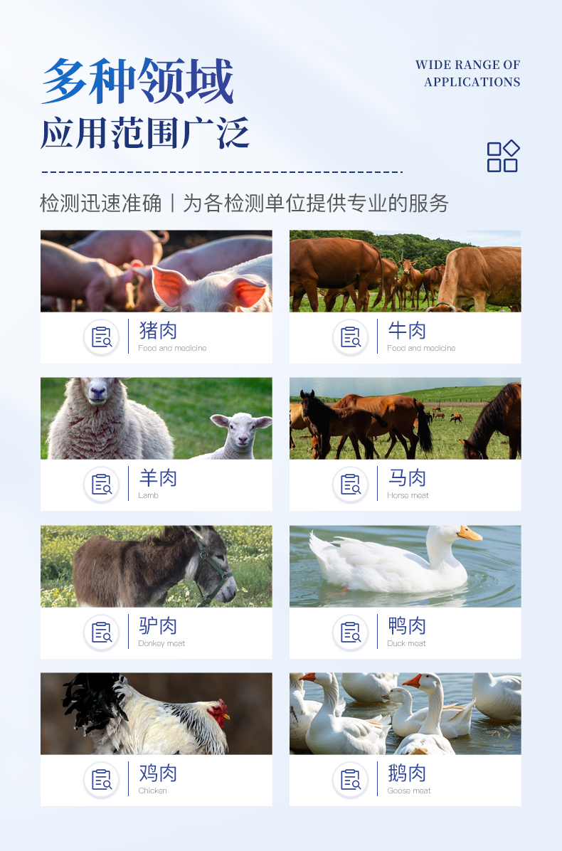 该仪器是一款**、便捷的食品检测设备,专为识别肉类的真假而设计。可以对猪肉、牛肉、羊肉、马肉、驴肉、鸭肉、鸡肉、鹅肉等各种动物源性进行检测。能够迅速、准确地检测肉类及肉源性种类,确保所食用的肉类真实可靠。检测迅速准确,为各检测单位提供专业的服务。