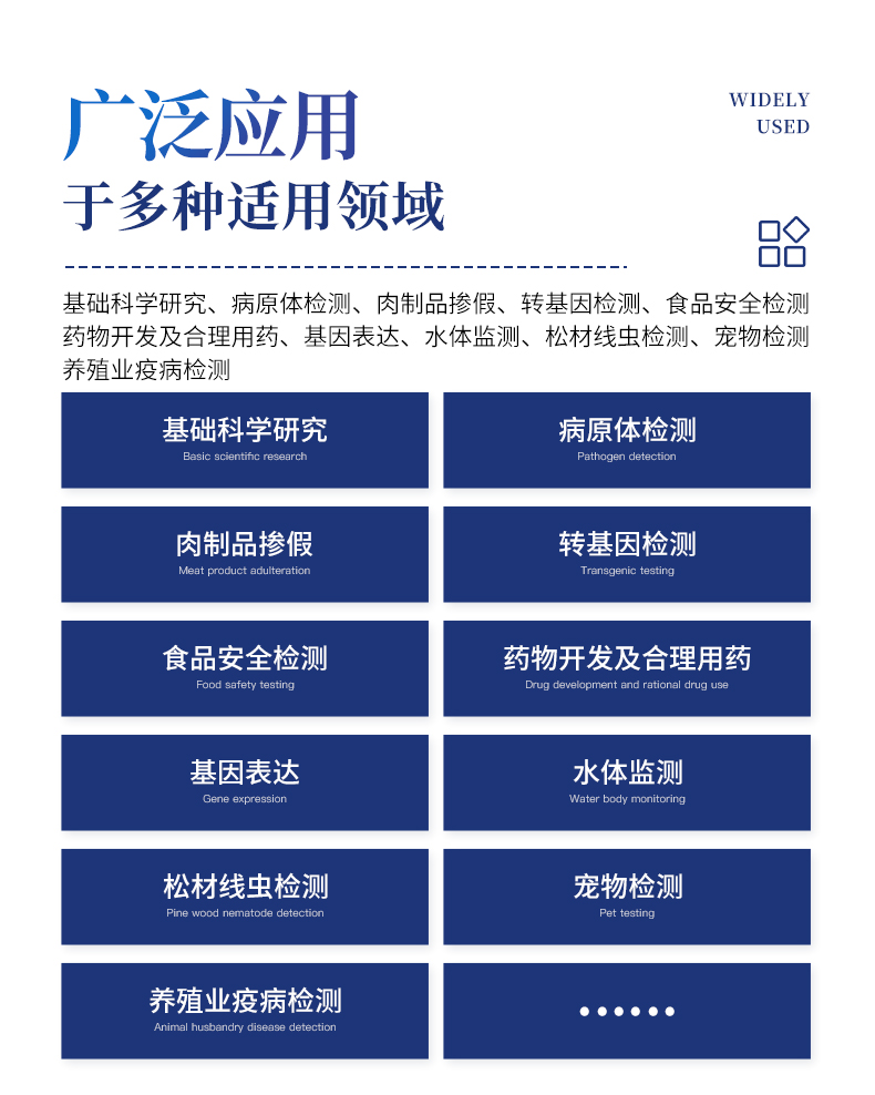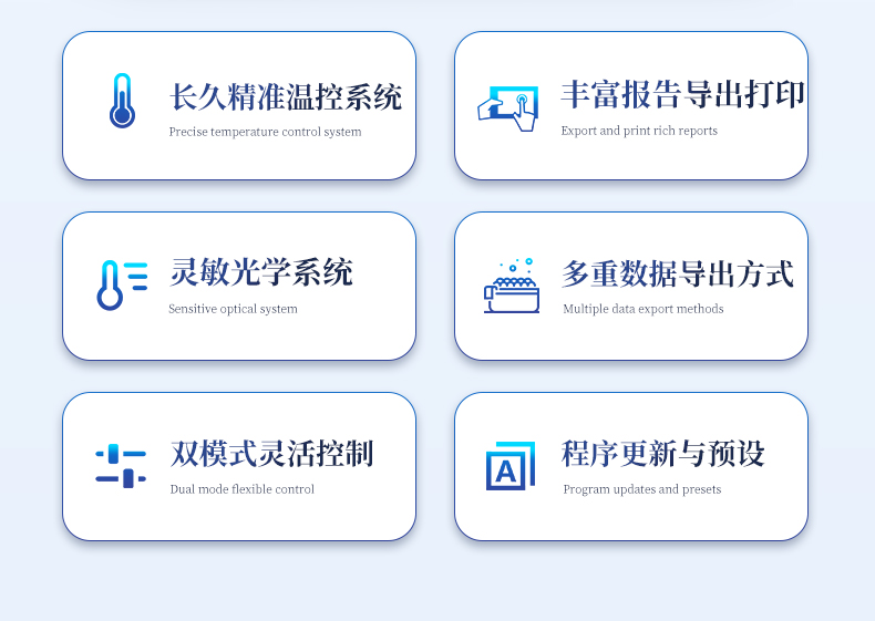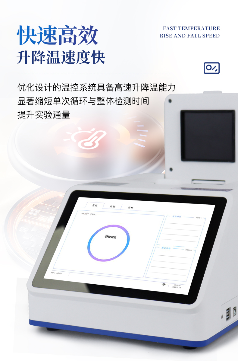 | 1.智能操作系统,实验尽在掌握 | A程序更新与预设:支持在线更新实验程序,并内置丰富的预设实验程序模板,用户亦可自定义保存常用模版,实现一键快速启动,极大提升操作效率。 | B操作简单:无论是触摸屏界面还是电脑软件,均设计得直观易懂,新用户也能快速上手。预置常用程序模板,进一步简化操作流程。 | 2.精准稳定的温控与光学核心 | A长久精准的温控系统:采用进口***TEC半导体制冷模块,控温精准(±0.1°C),孔间温度均匀性**(≤±0.3°C)。系统稳定性卓越,长期使用性能衰减小,校准周期长达数年,显著降低维护成本与运营中断。 | B免维护的灵敏光学系统:配备单个独立LED光源与单个独立光电二极管检测器,采用超长寿命进口光源,设计寿命期内免维护,无需额外校准或更换,保障检测结果长期一致性与高灵敏度。 | C卓越的数据质量:实验线性相关性高(R²≥0.999),重复性优异(孔间CV值低),确保定量结果准确可靠,数据置信度高。 | 3.**便捷的数据与输出管理 | A多重数据导出方式:支持通过USB存储设备直接拷贝,或经由Wi-Fi无线网络传输数据至本地服务器或云端,方便灵活,满足各类实验室数据管理习惯。 | B丰富的报告导出与打印:支持生成并导出多种格式(如PDF、Excel)的实验报告。仪器兼容USB热敏打印机、蓝牙无线打印机及常规A4打印机,可直接在仪器上或通过电脑一键导出并打印专业报告,便于结果存档与即时分享。 | 4.快速**与坚固耐用 | A升降温速度快:优化设计的温控系统具备高速升降温能力,显著缩短单次循环与整体检测时间,提升实验通量。 | B超长使用寿命:核心部件均选用工业级耐用材料与设计,整机运行稳定可靠,致力于为用户提供长久的投资回报。 |