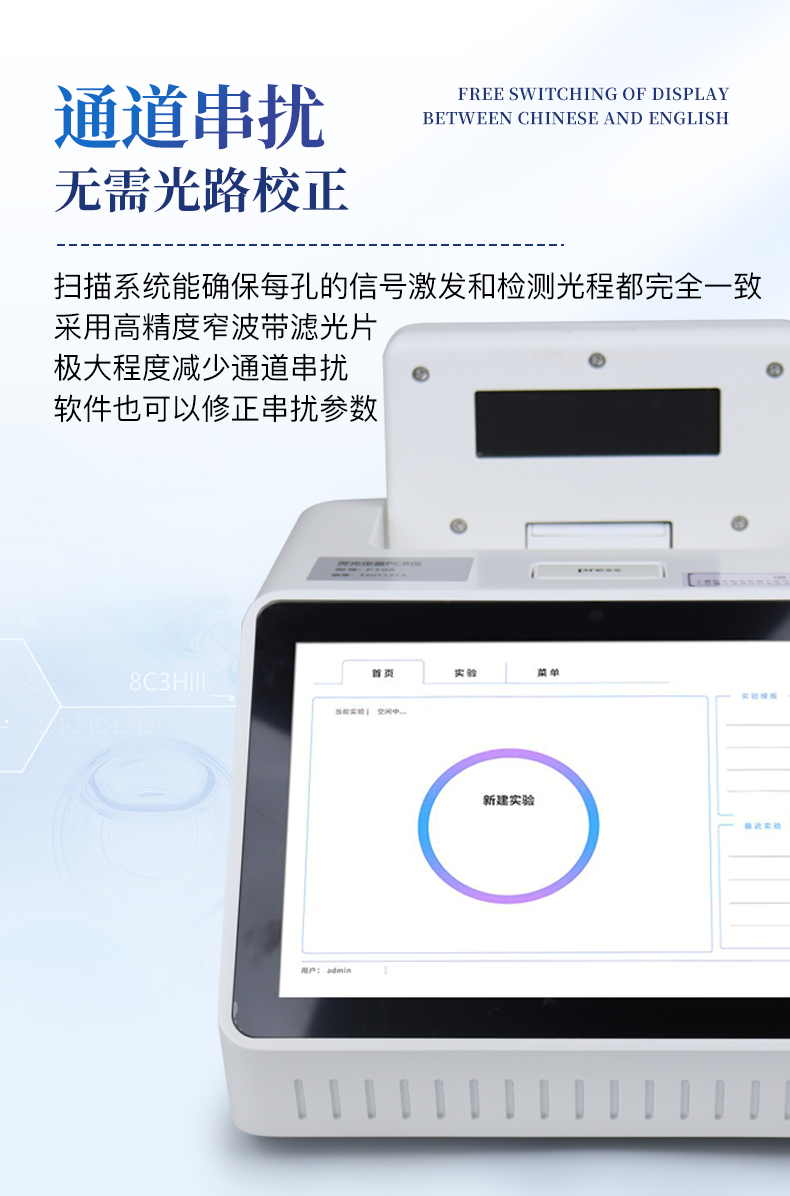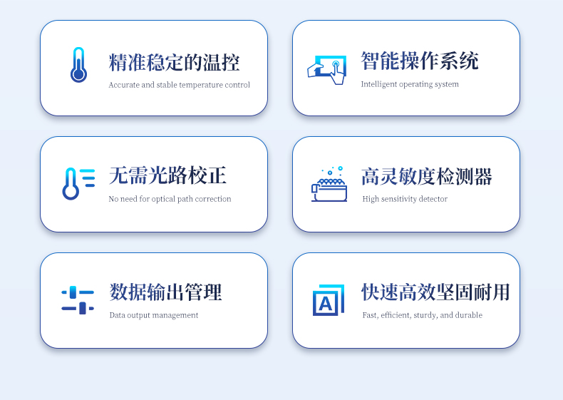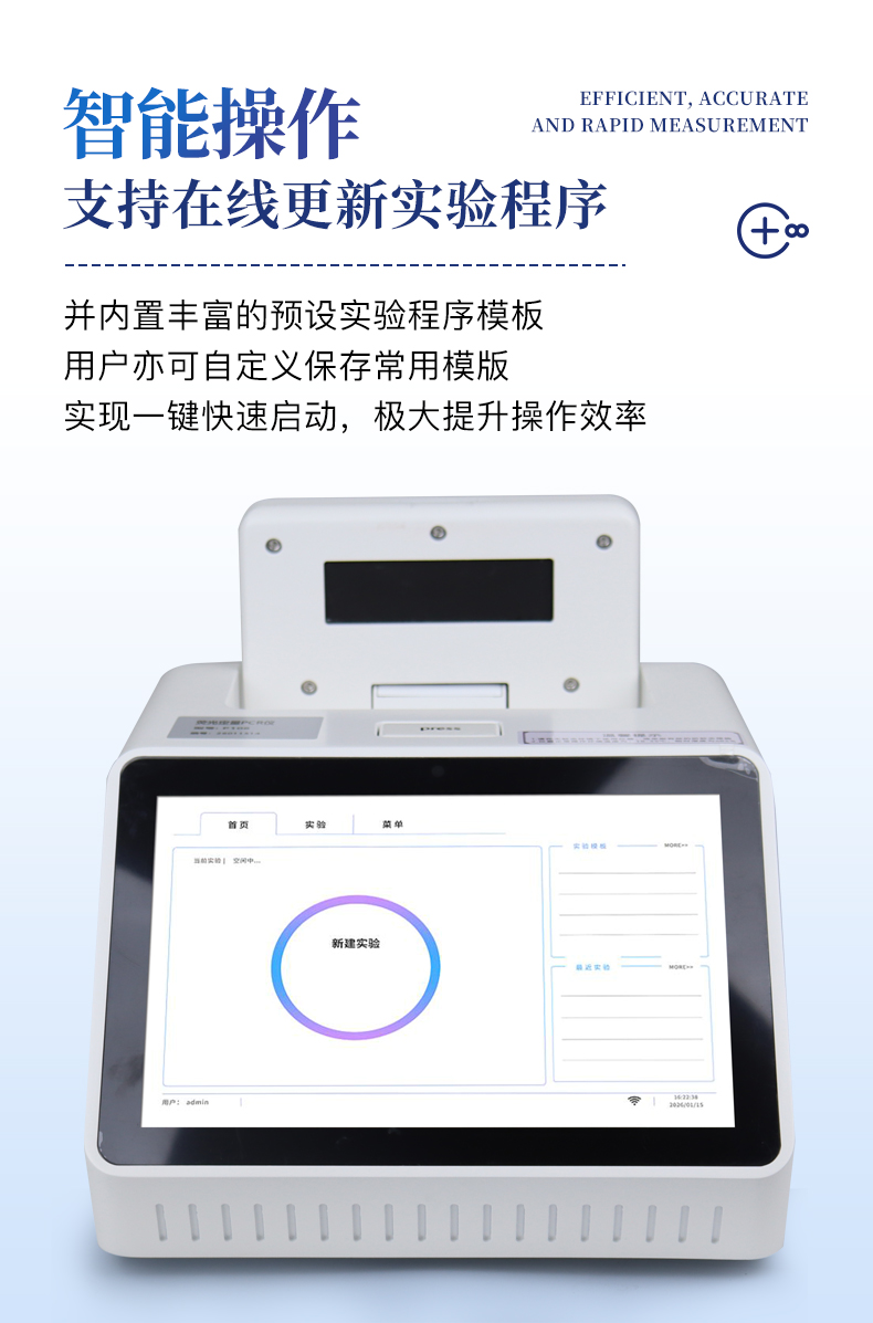 | 1.智能操作系统,实验尽在掌握 | A程序更新与预设:支持在线更新实验程序,并内置丰富的预设实验程序模板,用户亦可自定义保存常用模版,实现一键快速启动,极大提升操作效率。 | B极简启动体验(可选配):可定制集成摄像头扫描系统,用户只需扫描样品板或程序卡的二维码,即可自动识别并调用对应实验程序,简化流程,避免人为设置错误。 | C操作简单:触摸屏界面设计得直观易懂,新用户也能快速上手。预置常用程序模板,进一步简化操作流程。 | 2.精准稳定的温控与光学核心 | A长久精准的温控系统:采用进口***TEC半导体制冷模块,控温精准(±0.1°C),孔间温度均匀性**(≤±0.3°C)。系统稳定性卓越,长期使用性能衰减小,校准周期长达数年,显著降低维护成本与运营中断。 | B免维护的灵敏光学系统:配备2个独立LED光源与2个独立光电二极管检测器,实现双通道荧光同步精准检测。采用超长寿命进口光源,设计寿命期内免维护,无需额外校准或更换,保障检测结果长期一致性与高灵敏度。 | C卓越的数据质量:实验线性相关性高(R²≥0.999),重复性优异(孔间CV值低),确保定量结果准确可靠,数据置信度高。 | 3.**便捷的数据与输出管理 | A多重数据导出方式:支持通过USB存储设备直接拷贝,或经由Wi-Fi无线网络传输数据至本地服务器或云端,方便灵活,满足各类实验室数据管理习惯。(可选配) | B丰富的报告导出与打印:支持生成并导出多种格式(如PDF、Excel)的实验报告。仪器兼容USB热敏打印机、蓝牙无线打印机及常规A4打印机,可直接在仪器上或通过电脑一键导出并打印专业报告,便于结果存档与即时分享。 | 4.快速**与坚固耐用 | A升降温速度快:优化设计的温控系统具备高速升降温能力,显著缩短单次循环与整体检测时间,提升实验通量。 | B超长使用寿命:核心部件均选用工业级耐用材料与设计,整机运行稳定可靠,致力于为用户提供长久的投资回报。 |