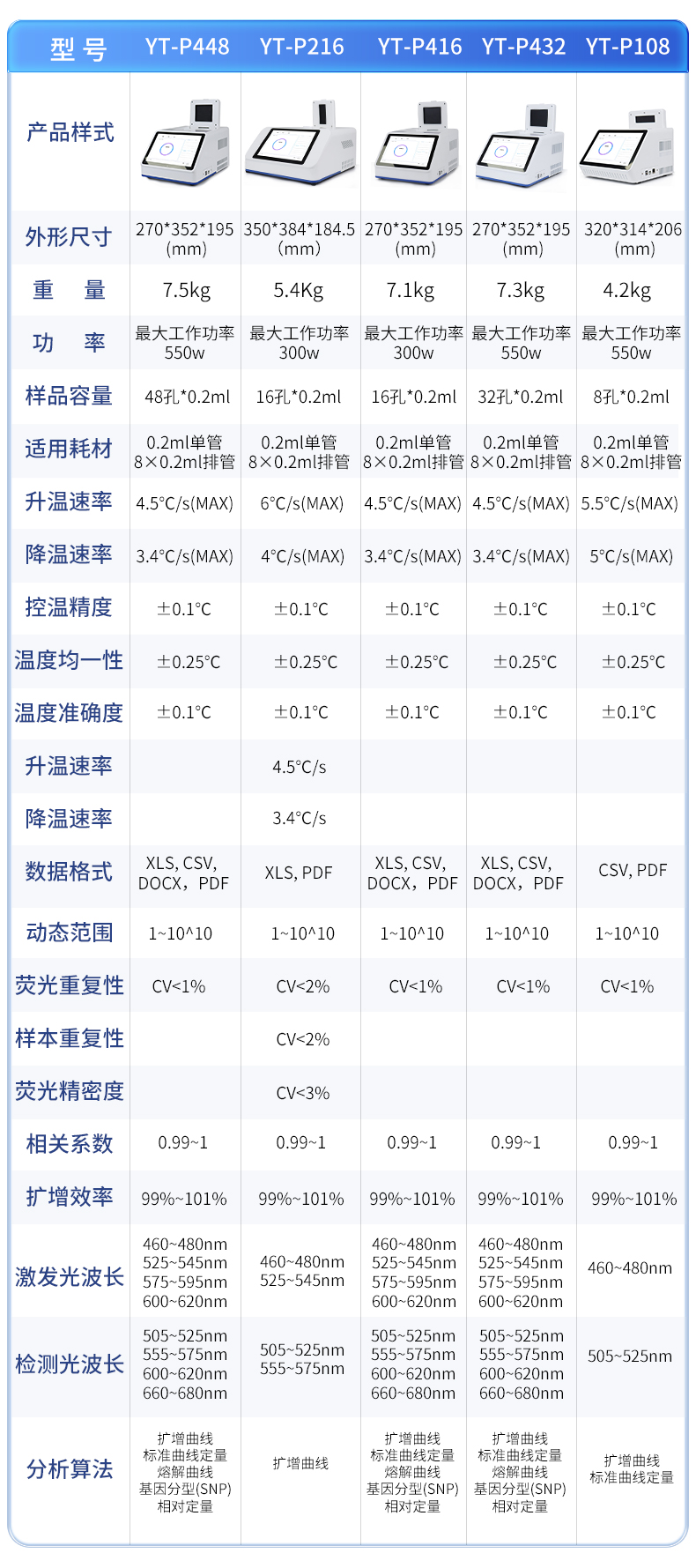| 基本性能 | 外形尺寸:350*384*184.5mm | 重量:5.4Kg | 电源:220V | 功率:**工作功率300w | 操作系统:自带Android操作系统 | 外接电脑:外接windows电脑(win7系统以上) | 通信接口:方形USB | 操作环境参数 | 操作环境温度:18~35℃ | 操作环境相对湿度:0%~85% | 运输及储存温度:-20~55℃ | 运输及储存相对湿度:0%~85% | 系统性能 | 样品容量:16孔*0.2ml★ | 样品容积:15~100ul | 适用耗材:0.2ml单管、8×0.2ml排管★ | 控温范围:4~99℃ | 热盖温度:30℃-108℃(默认105℃,热盖温度可调) | 温控方式:高性能进口半导体 | 升温速率(MAX):6℃/s(MAX)★ | 降温速率(MAX):4℃/s(MAX)★ | 升温速率(平均):4.5℃/s★ | 降温速率(平均) :3.4℃/s★ | 控温精度:±0.1℃★ | 温度均一性:±0.25℃★ | 温度准确度 :±0.1℃★ | 操作功能:预设项目和分析参数,操作简单方便 | 分析功能:具多重qPCR数据分析功能,可同时检测2个检测通道 | 分析算法:扩增曲线 | 支持HRM检测:支持 | 数据导出:可将实验结果以图形和表格的形式直接导出;详细的数据报告内容包括实验条件,数据坐标和表格,数据分析参数。★ | 数据格式:XLS, PDF★ | 荧光检测系统性能 | 检测灵敏度:可检测单拷贝基因 | 动态范围:1~10^10★ | 荧光重复性:CV<2%★ | 荧光重复性:CV<2%★ | 荧光精密度 :CV<3%★ | 相关系数:0.99~1★ | 扩增效率:99%~101%★ | 可信度:区分1000与2000拷贝浓度差异 | 激光光源:大功率LED(免维护,寿命长) | 检测器:高灵敏度光电传感器 | 激发和检测传播介质:耐高温专业导光光纤 | 激发光波长:460nm~480nm , 525nm~545nm, | 检测光波长 :505nm~525nm , 555nm~575nm , |