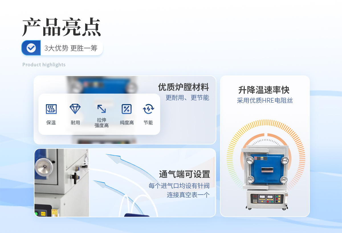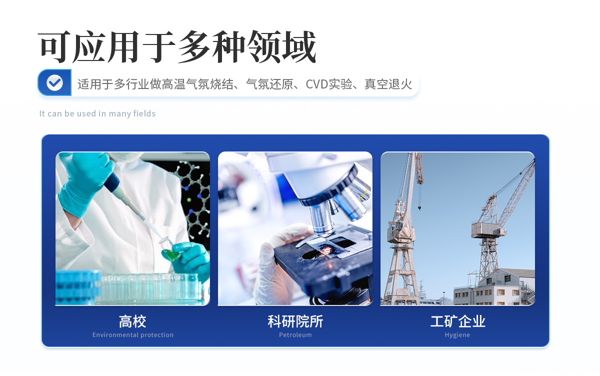 用于高校、科研院所、工矿企业做高温气氛烧结、气氛还原、CVD实验、真空退火等。具有温场均匀、升降温速率快、节能、可通入多重气体等特点。