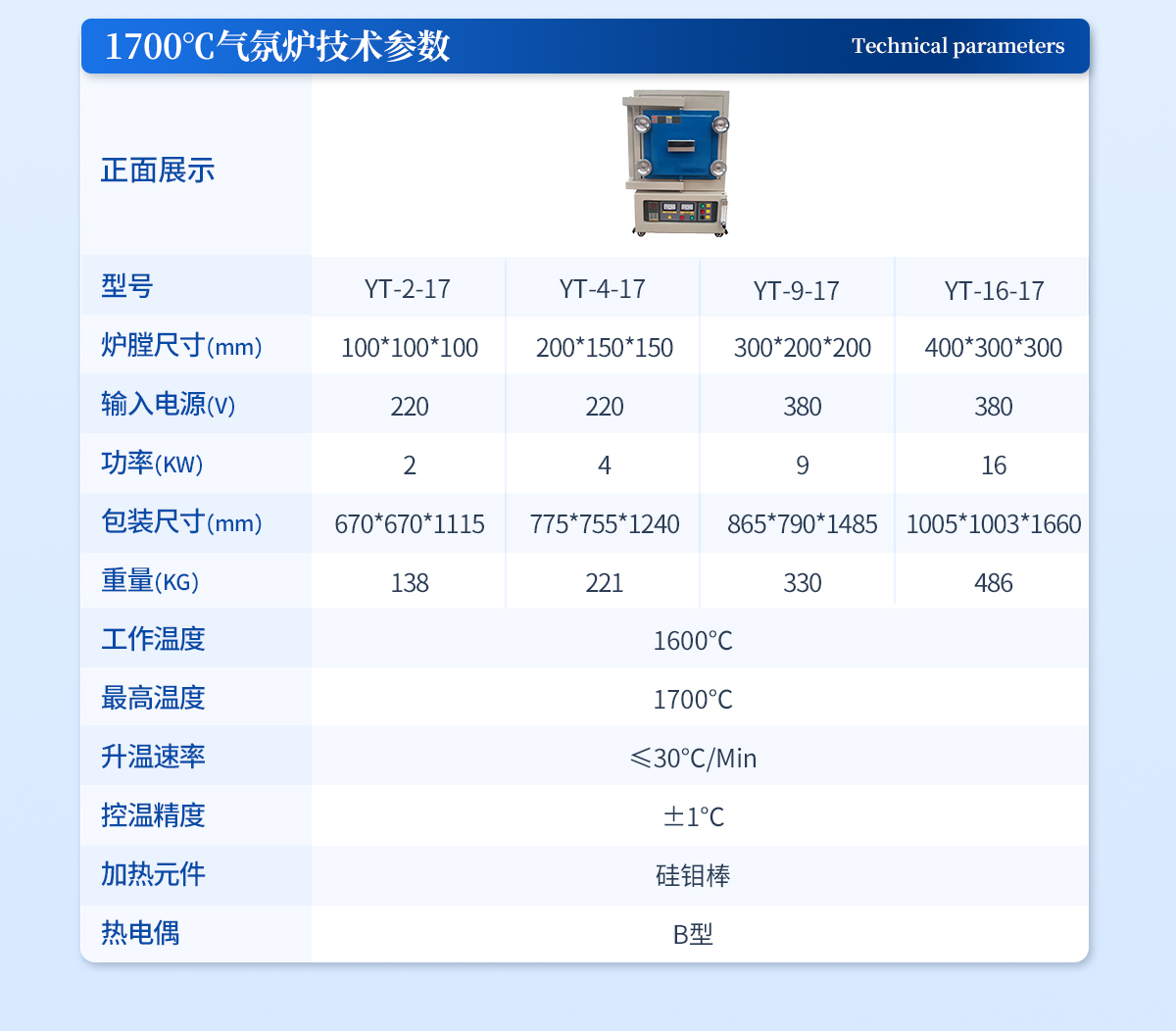 工作温度:1600℃ | **温度:1700℃ | 升温速率:≤30℃/Min | 控温精度:±1℃ | 加热元件:硅钼棒 | 热电偶:B型 | 工作电压:220V 50hz | 功率:2Kw |