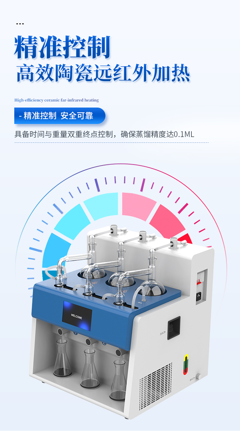 | 1.自动化程度高:内置冷却水循环机,实现全自动化操作,提高实验效率与准确性。 | 2.多通道独立控制:3个加热单元各自独立,配备防倒吸、防过量蒸馏及防干烧保护。 | 3.智能触控:7寸液晶触摸屏,支持自定义保存*多1000种蒸馏方法,内置18种国标方法。 | 4.精准控制:采用**陶瓷远红外加热,具备时间与重量双重终点控制,确保蒸馏精度达0.1ml。 | 5.安全可靠:集成自动清洗、自动气密检查、反吹等功能,确保设备长期稳定运行。 | 6.操作简便:一键启动,支持远程OTA系统升级,满足不同用户的使用需求。 |